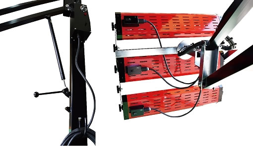 最大地上高2.6mオーバーで高所の乾燥も800mm幅の3灯式ヒーターにハイルーフ対応が登場。バンクを下に向けた状態で最大地上高が2610mmまで上がるので、ワンボックス・ハイルーフ車の乾燥も可能です。バンクの上げ下げはガスダンパー式でレバー操作で簡単に行え、各ヒーター球に独立スイッチも装備。
